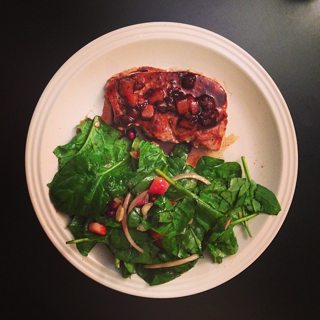 After a long day in the clinic, I don’t want to spend hours slaving away in the kitchen. Don’t get me wrong! I love cooking and I enjoy spending time on it, but when I’m seeing patients from 9 am until 7 pm (sometimes foregoing a proper lunch break), all I want to do when i get home is eat. This dish is quick, easy, and delicious, so its perfect to whip up when I want to be eating within 20-30 min of getting home. I made this specific dish with pork chops, but you can sub the pork for chicken breast, too!