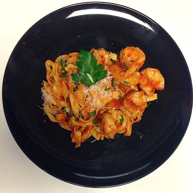 So first, I’ll sauté the shrimp in a bit of butter, olive oil, and chopped garlic. Once they’re almost cooked (almost all the way pink), I’ll throw in the Rao’s arrabiata sauce and heat it up. then I toss in the noodles and dinner is served! Garnish with some parsley (if you wanna get fancy) and be generous with the parmesan. always.http://instagram.com/p/qtuqU8jm_w/