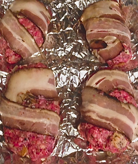 Shape the meatloafs with your hands into oval-ish patties, and then wrap them in bacon. This turns out about 4 mini-meatloafs, but you can make them any size you want! This is what mine looked like: