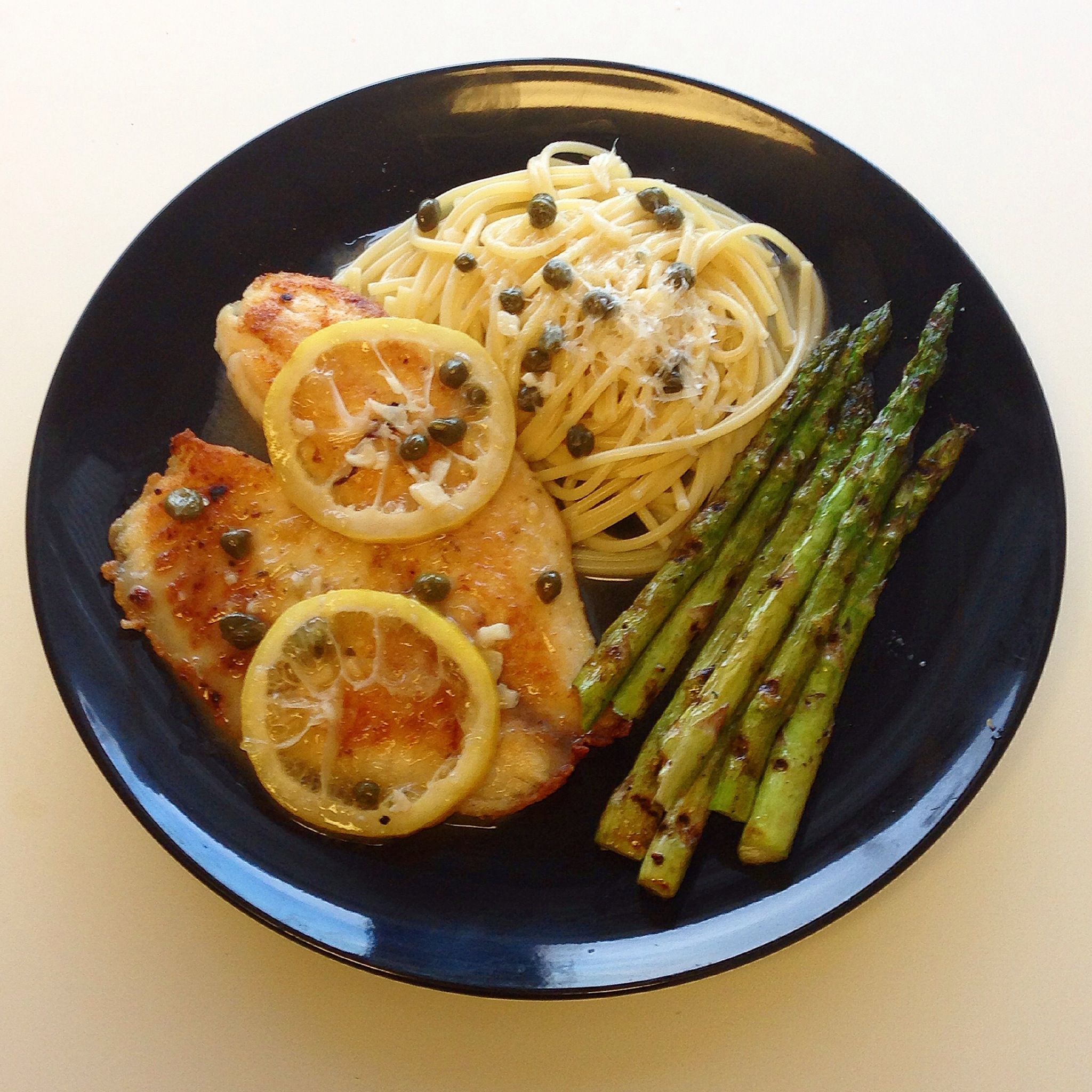 I was in the mood for something bright, flavorful, and tangy. Luckily, I happened to have the perfect ingredient that embodies all of these traits: lemon. So tonight, I made tilapia piccata with a side of pasta and some grilled asparagus. This was my first time grilling the asparagus, and I have to say… I may never steam again. The slight char on them brought a different dimension of flavor to the table, and it really played well with my tangy piccata sauce. You could definitely swap the tilapia for a thin chicken cutlet in this recipe, but the tilapia was super delicious 🙂