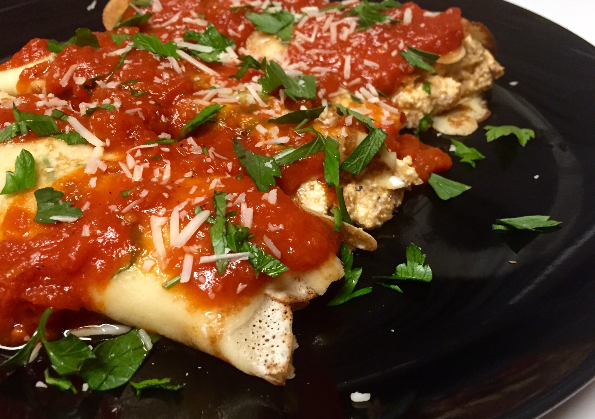 Once the crepes were cooked, I stuffed them with the meat and cheese and topped them with some of yesterday’s marinara sauce and parmesan cheese (and parsley for garnish).