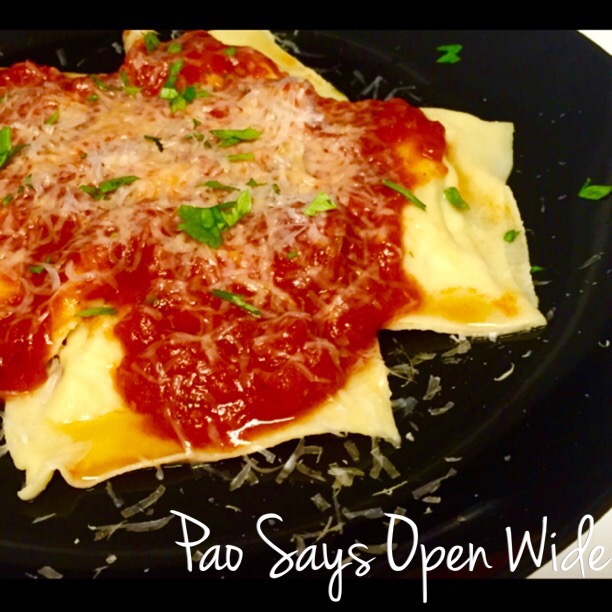 Once the ravioli are floating up at the top of the boiling water, remove them from the pot using a slotted spoon and plate them. Pour some sauce and parmesan cheese over them and voila! You’re eating a fresh, delicious, home-made Italian dish!