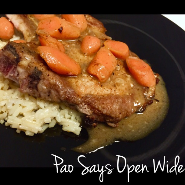 Plate your pork chops and pour the carrots and sauce over the top of them! Enjoy!
