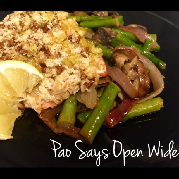 My sister, Vanessa, and I have been apart for far too long. A few days ago, she made a bomb salmon recipe that she found online. Lucky for me (and for Ryan), she sent me the recipe so I could try it out too! I have to say, Vanessa definitely picked a winner, and I’m happy to share it with you! She made mashed potatoes and broccoli as her sides, which I think would go famously with this sweet and tangy salmon dish. After eating a huge helping of extra rich and cheesy mac and cheese last night, I decided to drop the potatoes and just go with some veggies. I paired the salmon with a mix of asparagus, mushrooms, and red onions with some butter, a splash of chicken stock, and a squeeze of lemon. The lemon brought out the brightness in the asparagus and added a tang to the veggies that really complemented the salmon. Definitely give this quick, easy, delicious recipe from allrecipes.com a try soon!