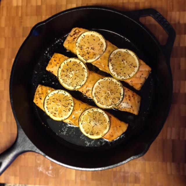 The main picture on the first page is of a variation I made of this recipe. I didn’t use the breading, and I added soy sauce to the marinade. I put the honey-mustard-butter-soy marinade on the salmon, and then placed 2 thin lemon rounds on each filet. I cooked them in my Lodge cast iron skillet in the same method described above. Check it out!