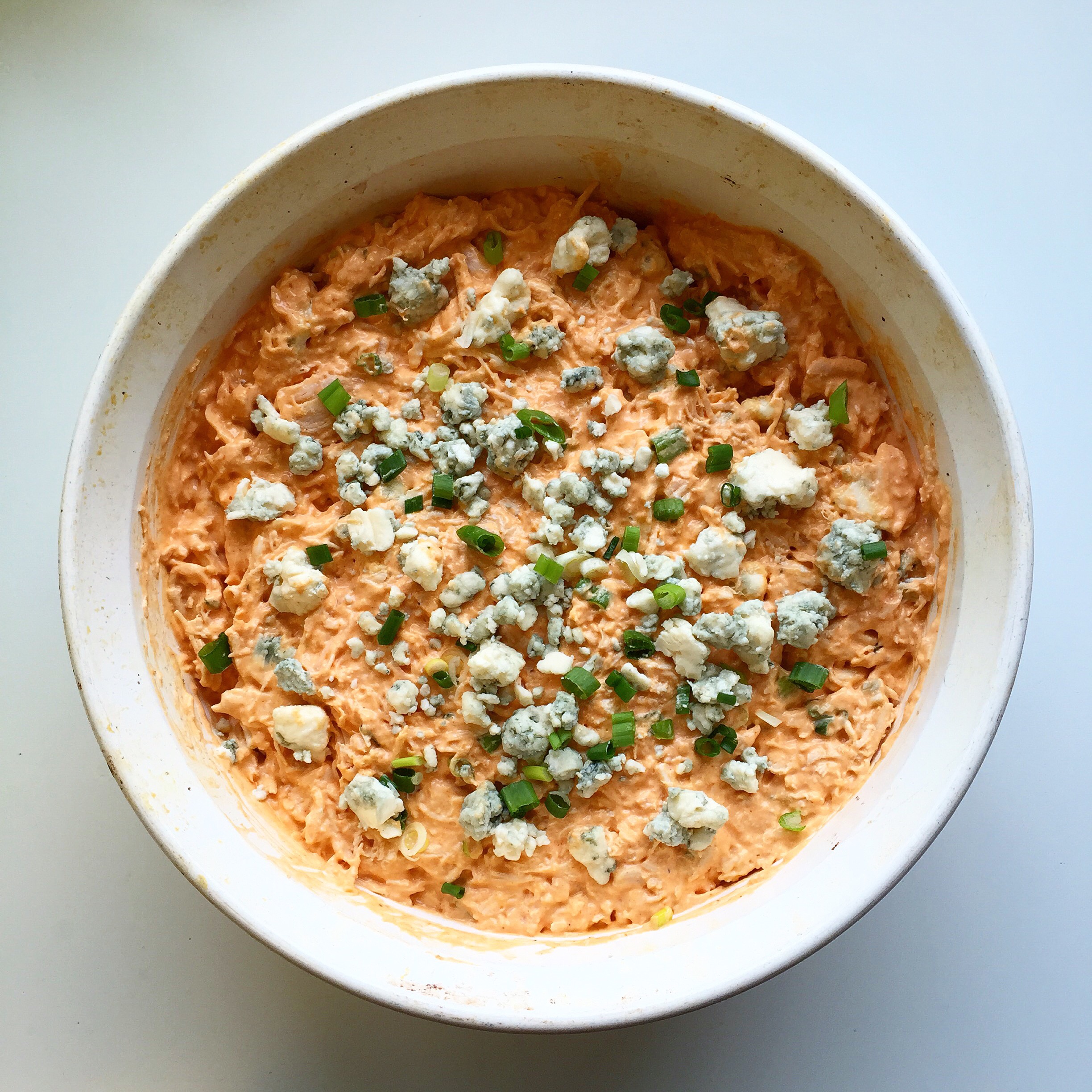 Put in oven-safe pot/bowl/dish, and top with blue cheese crumbles and scallions!