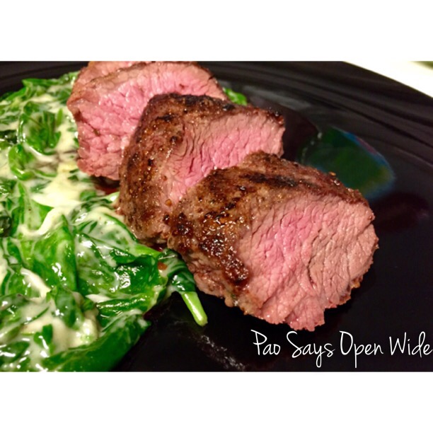 Earlier today, I dragged my husband, Ryan, down to midtown to satisfy my serious ramen cravings. We went to Ippudo, and it was delicious, as it always is. Being that our breakfast was oatmeal (apple-cinnamon with pecans… Recipe up soon!), and our lunch was a giant, hearty bowl of Ramen, I figured I would make a pretty lean dinner. My creamed spinach is pretty light and very easy to make… This whole dinner took me about 20 minutes to make start to finish!