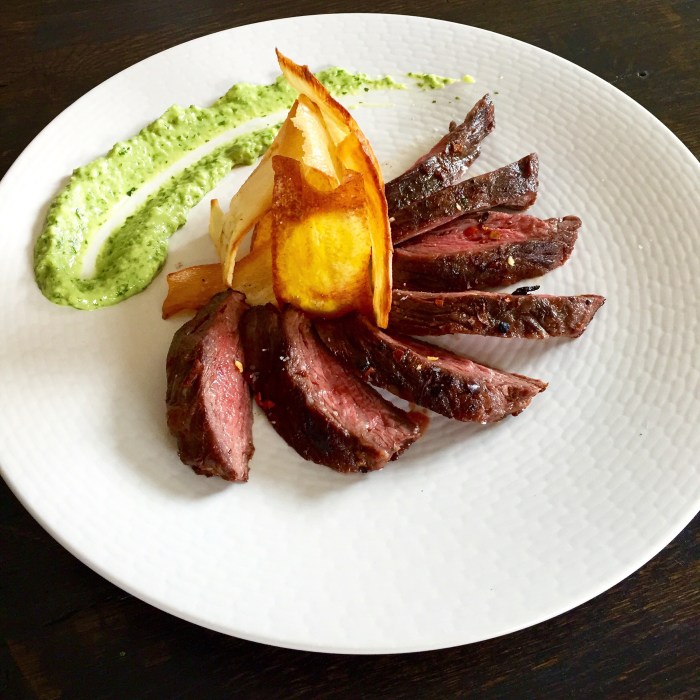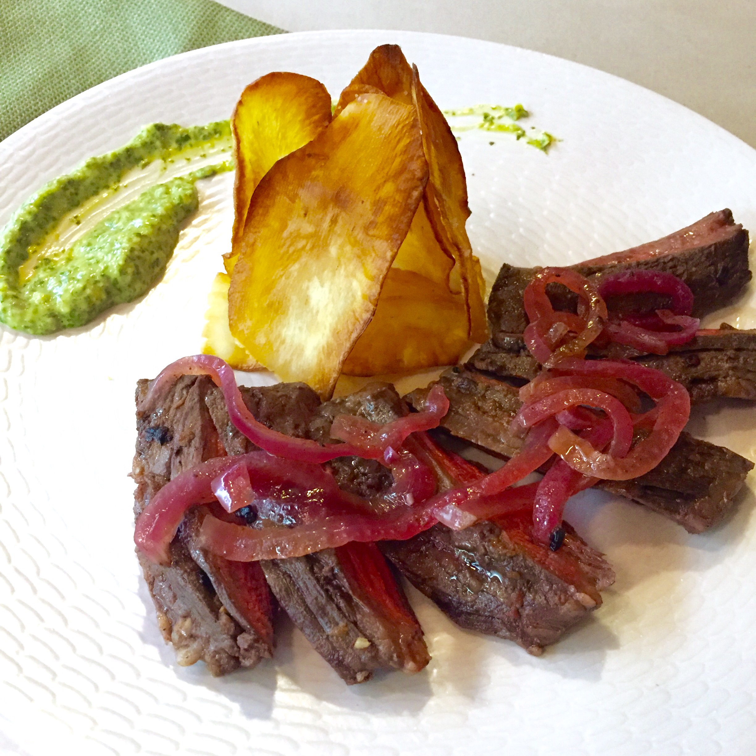 Churrasco with Pickled Onions, Crispy Yuca Chips, and Creamy Chimichurri